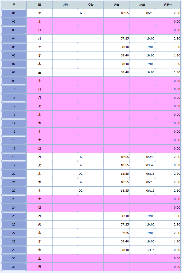 19日(火)に加えて棚卸しがあった29日(金)も定時でしたが、最終週は2回も早出があったため最終的に1日あたりの残業時間は普段と同じくらいに収まりました